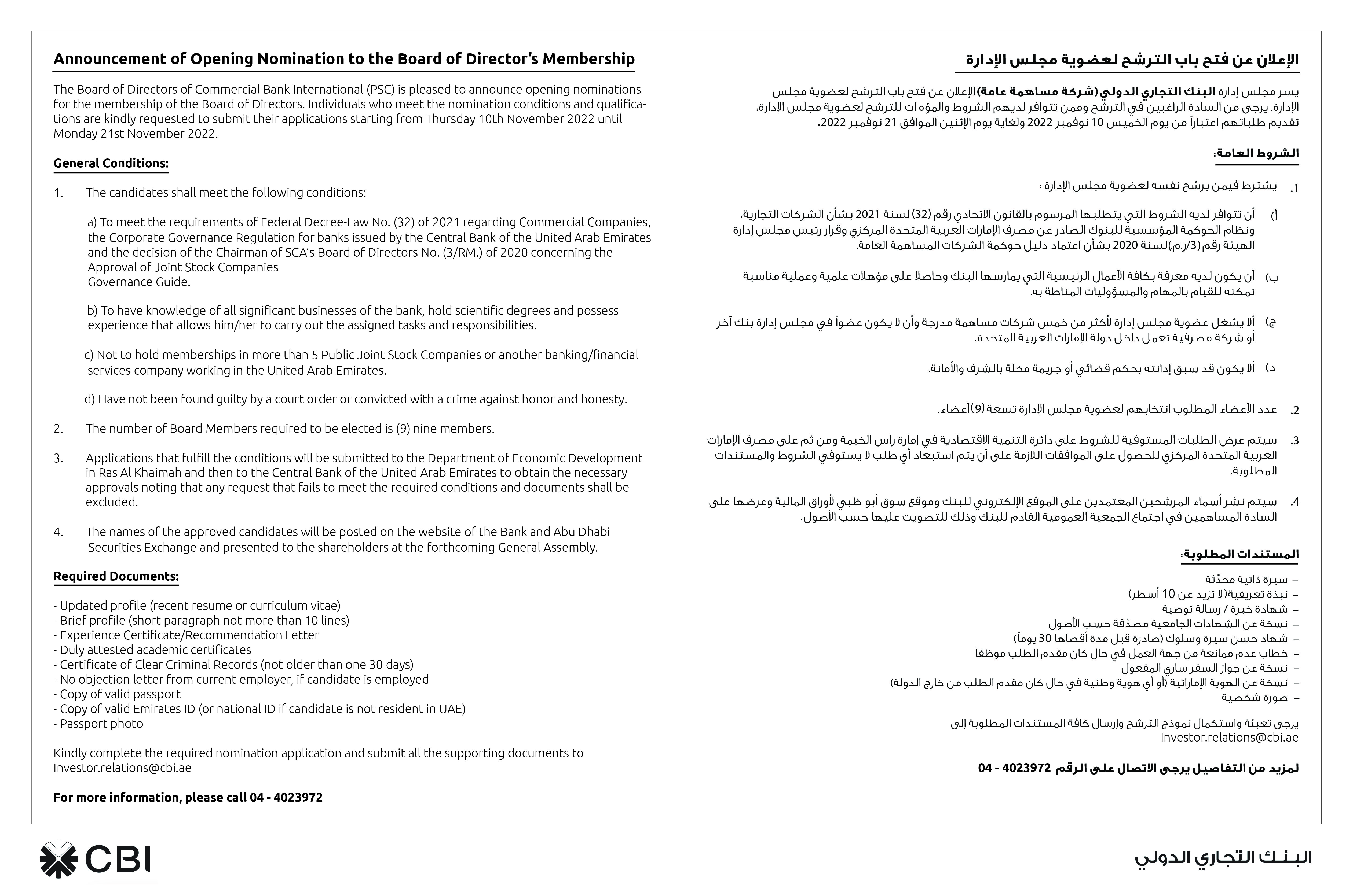 Announcement of Opening Nomination to the Board