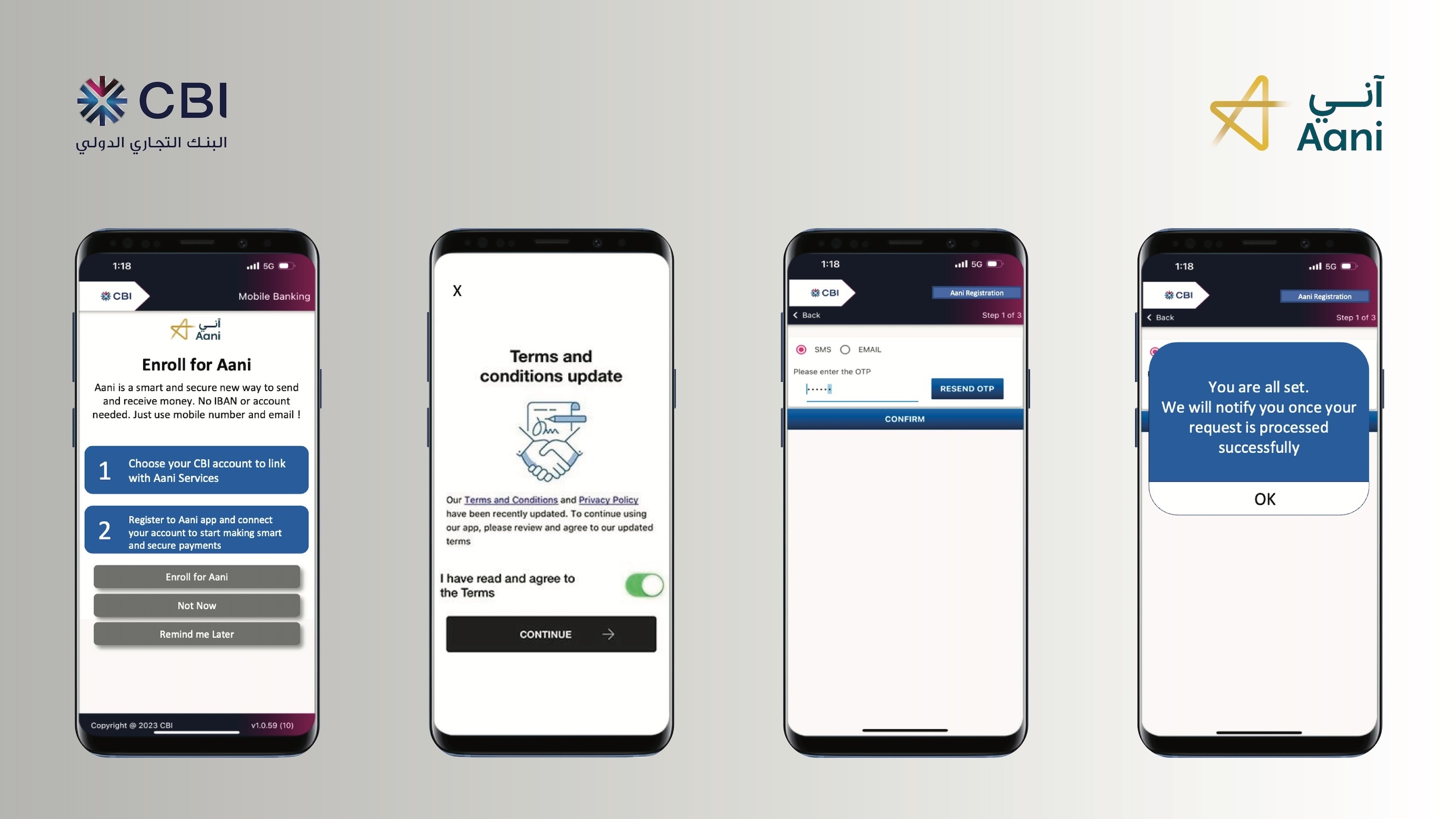 Simply login to your CBI mobile banking app, tap ‘Enroll for Aani’ and accept the Terms and Conditions. You’re ready to start using Aani.