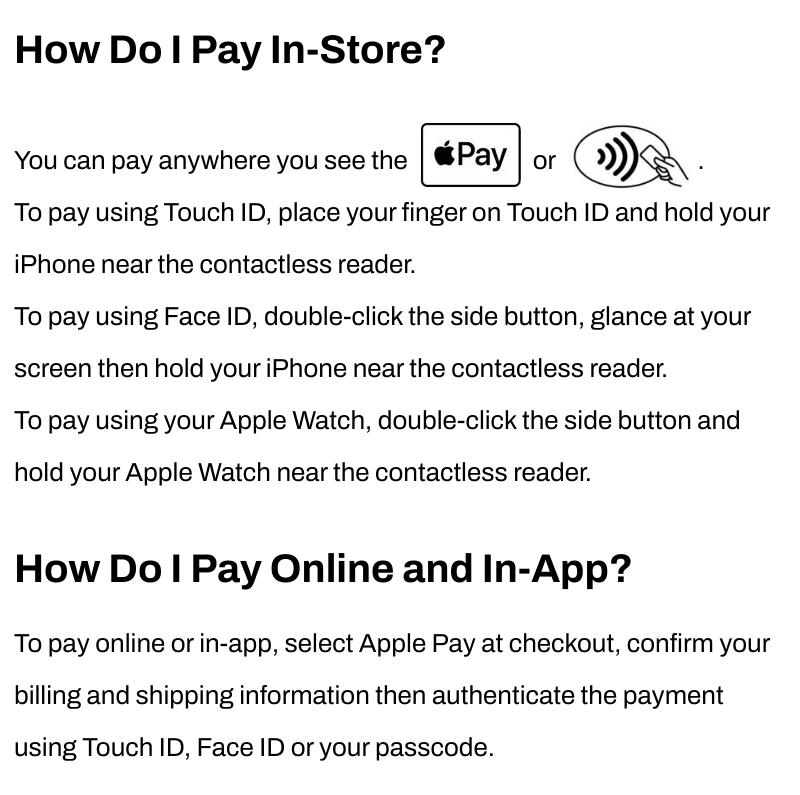 To pay online and in-app, select Apple Pay at checkout where available, select your desired card or address info and authenticate the payment using Touch ID, Face ID or your passcode.